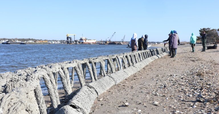 With assist from Sandbar Oyster Firm, a neighborhood enterprise that makes ecofriendly residing shorelines, we deployed the Battery Island a part of the undertaking in February. Particularly, we put in a biodegradable hardscape composed of plant-fiber cloths and a mineral-based hardening agent on Battery Island.