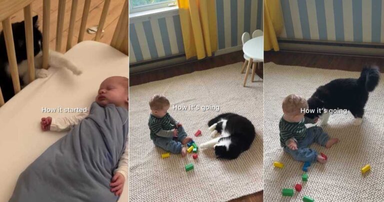 As time passes and the newborn grows older, Minnie stays shut, gently watching the newborn transfer and staying close by throughout playtime. The textual content overlay on the video reads, “The way it’s going.” She chooses to remain near the newborn, usually curling up beside him or calmly watching his actions. Her physique language stays tender and protecting.