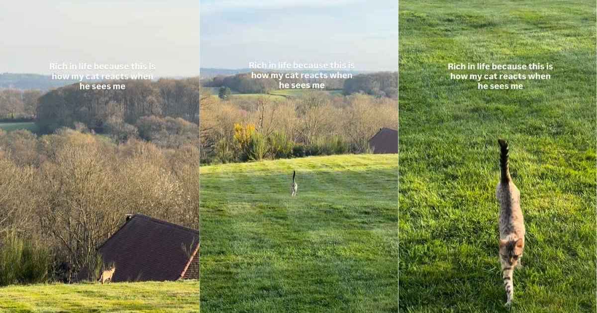 Beat by beat, the video units the scene. We first see rolling countryside and a large garden. The cat seems within the distance, pauses, and clocks the decision. Music swells. He launches right into a dash, tail straight up, ears ahead. As he closes the hole, Jasmine steadies the cellphone. The kitty slows, trots the final steps, and reaches her with a straightforward, content material look. The lower ends on closeness, not tips.