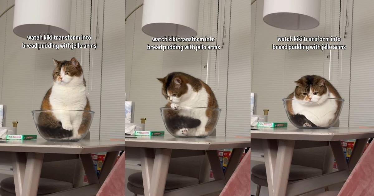 Within the opening shot, the Cat sits on a eating desk inside a transparent bowl. The on-screen textual content reads, “watch kiki remodel into bread pudding with jello arms.” The caption jokingly describes how obsessed Kiki’s mother and father are along with her.