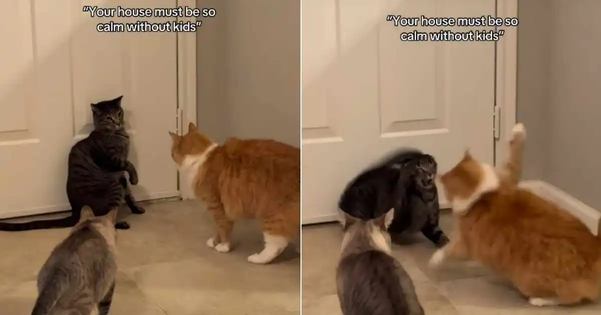 The video’s on‑display screen caption teases the cat battle: “Your home should be so calm with out youngsters,” and but, seconds later, the cats show that “calm” is the final phrase anybody would use.