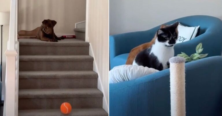 Should you love watching cat movies the place they’re in good synch with one another, then this clip is a must-watch. The reel exhibits how stunned the cat acts when the canine drops the ball down the steps. Not solely are the felines amused by the canine’ play. Nevertheless, additionally they react to the scenario in a well-coordinated manner, leaving the mother laughing.