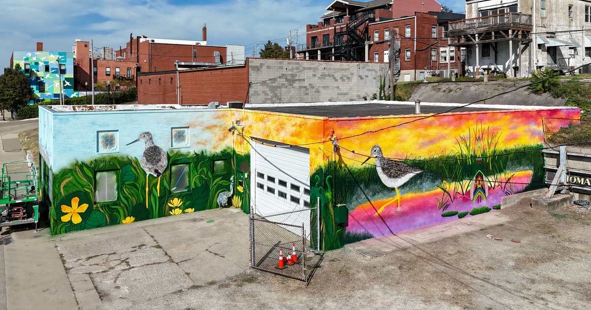 Within the mural, the Lesser Yellowlegs wade by way of reeds towards a vibrant orange, pink, and purple sky. When the solar units over downtown, the mural “spills over to the precise sundown,” says Robert Fishbone, the artist behind the mural.