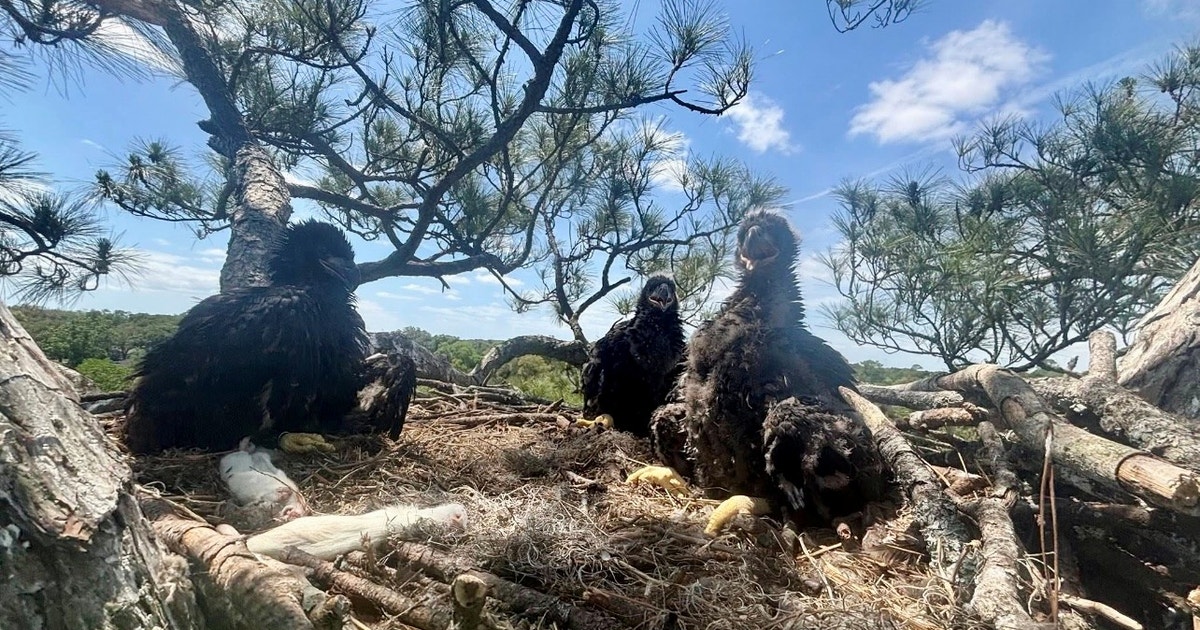 EagleWatch workforce members sought the required federal, state, and landowner permissions to entry the spacious nest, the place an skilled, volunteer tree climber positioned the eaglet. The eagles welcomed their new member of the family and, a number of weeks later, all three eaglets fledged inside 24 hours of one another.
