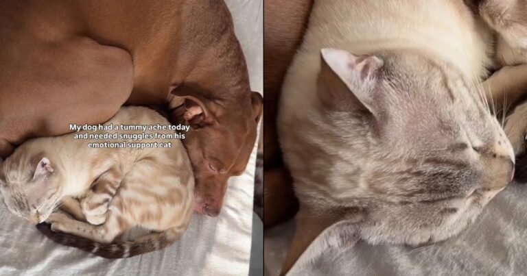 The clip options Opie, a Pit Bull, curled up intently along with his house cat pal in a peaceable second at dwelling. In accordance with the on-screen textual content, Opie wasn’t feeling his finest that day and was coping with a tummy ache. As a substitute of resting alone, he sought consolation from his feline companion, described affectionately as his “emotional assist cat.”