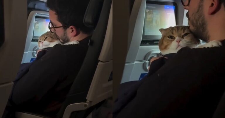 Onscreen textual content explains the state of affairs with humor, studying, “My lady cat giving me the facet eye on the airplane whereas cuddling along with her boyfriend (he’s my husband).” Because the dad holds Phoebe shut, the cat’s expression shifts between contentment and delicate judgment, particularly at any time when she glances towards her mother. The appears are gradual, deliberate, and dramatic sufficient to counsel that Phoebe is absolutely conscious of the awkward love triangle.