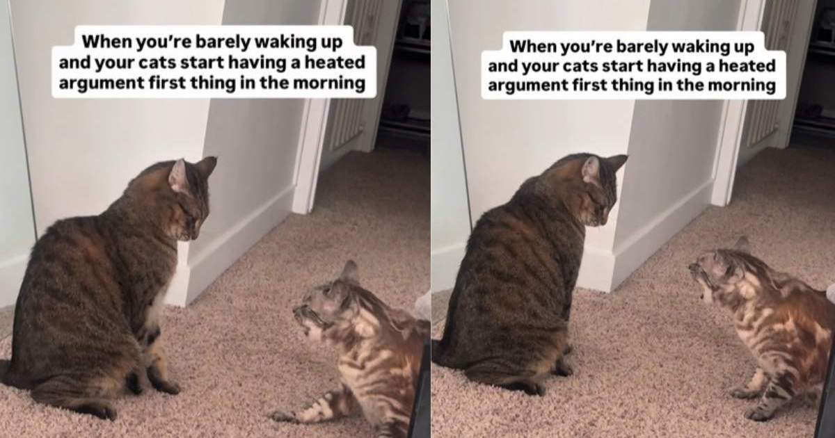 The now-viral reel opens with an all-too-relatable situation for cat house owners. The on-screen textual content reads: “If you’re barely waking up, and your cats begin having a heated argument very first thing within the morning.” The video captures two of the cats locked in an intense face-off. Inside seconds, the alternate escalates right into a dramatic volley of meows, chirps, and sharp vocalizations that sound far too severe for the early hour.