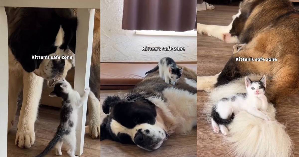 This canine retains the kitten secure. A video captures a tiny kitten adopting a Saint Bernard as her “secure zone.” Within the kitten-and-dog clip, the newborn cat boops the massive pup’s nostril below a desk, then curls on his fluffy tail like a pillow. The pair later shuffle throughout the ground, the kitten trotting in his canine companion’s shadow. Seasonal audio performs within the background, matching the comfy vibe. It’s a quick, candy slice of interspecies belief that lands immediately with viewers.
